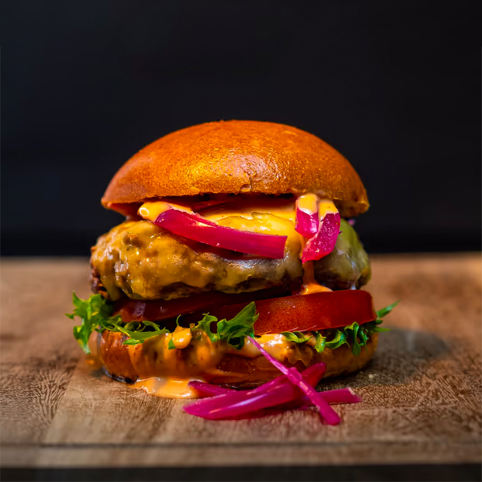 Briossisämpylä, 100% Suomalinen naudanpihvi, sriracha chili majoneesi, Monterey Jack sheddarjuusto, pikkelöity punasipuli, tomaatti ja jääsalaatti