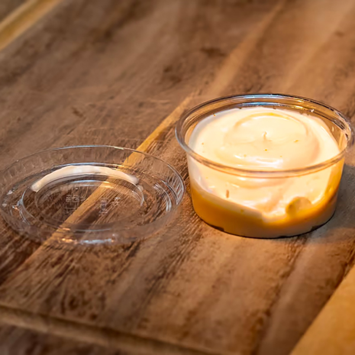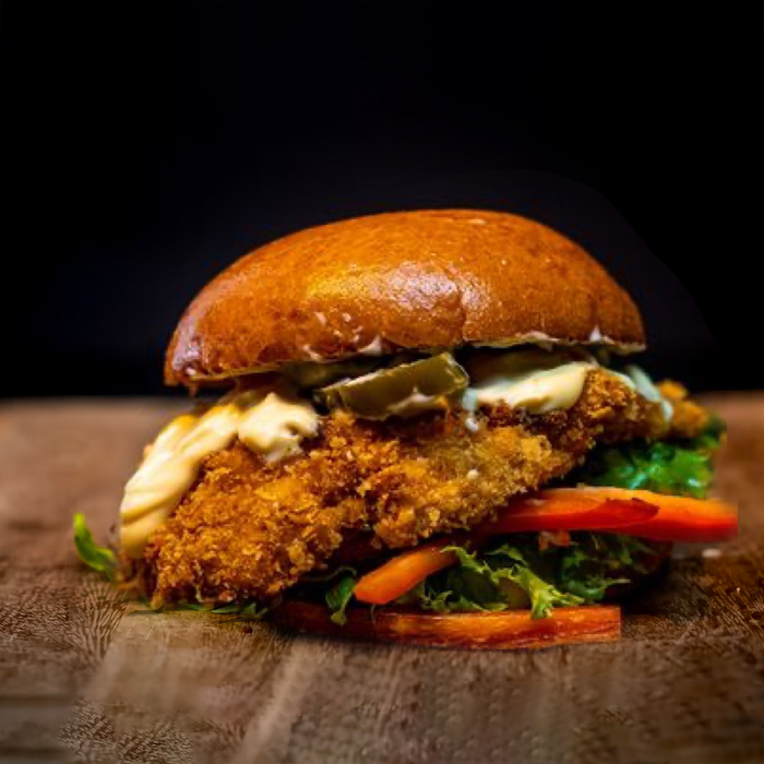 Briossisämpylä, itsetehty crispy-kanapihvi, Häptonmajoneesi, pikkelöity punainen paprika, ja jääsalaatti