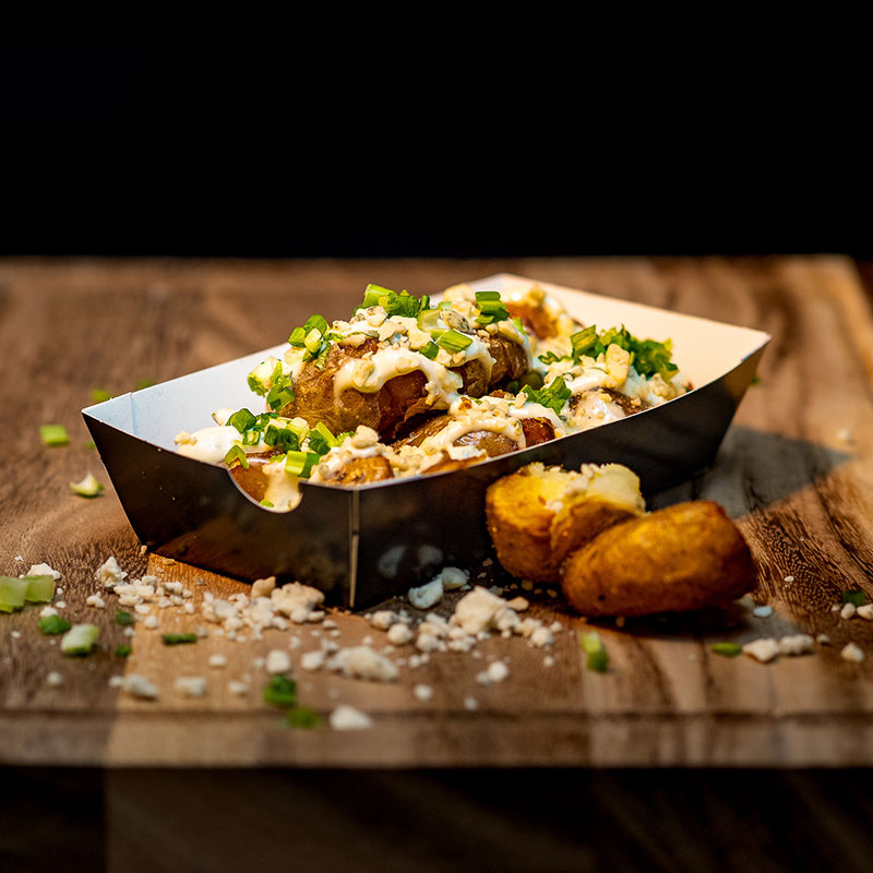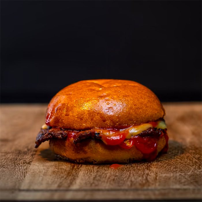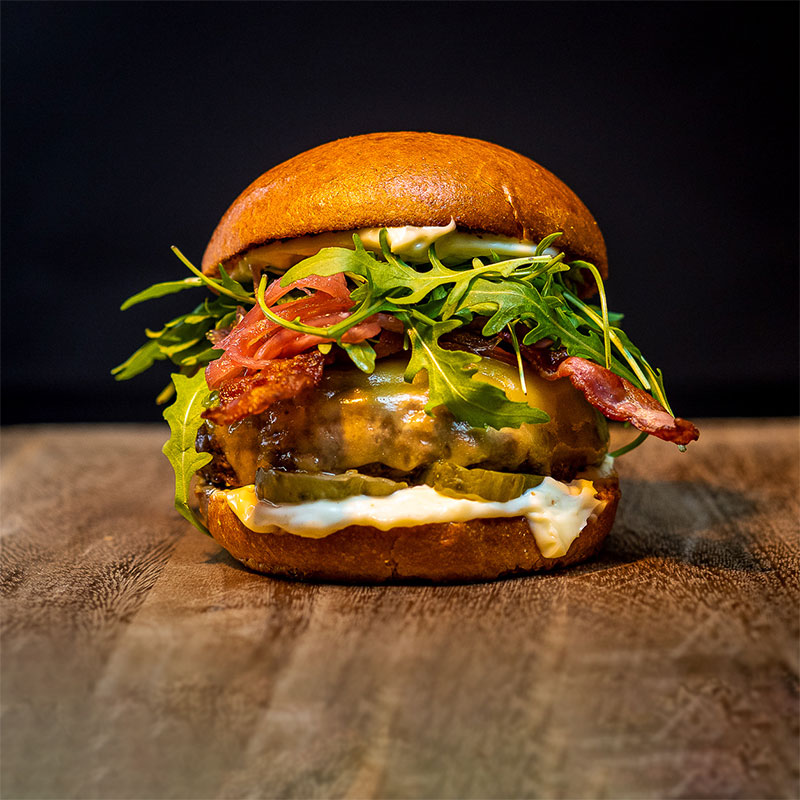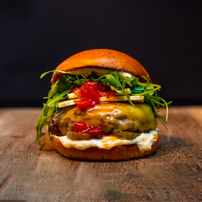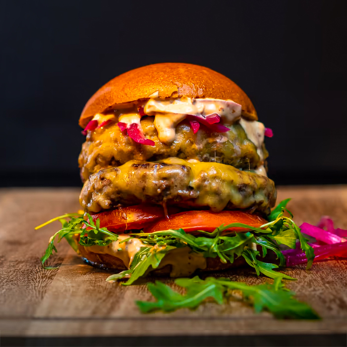 Perunasämpylä, 2 x smash pihvi, 2 x cheddarjuusto, paahdettu habanero, sinihomejuusto, paholaishillo, pikkelöity punasipuli, rucola, valkosipulimajoneesi vip, tomaatti