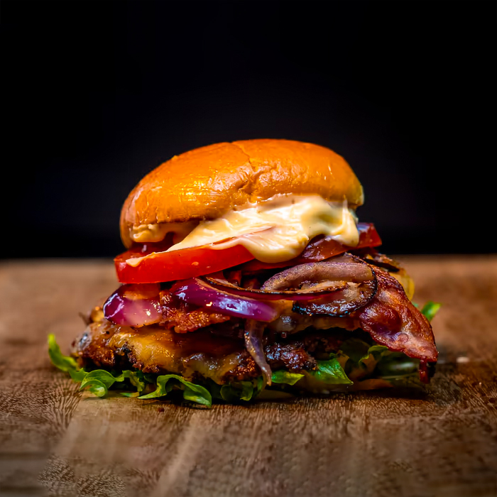 Martins´s -perunasämpylä, 2 x -smashpihvi, Hämpton-majoneesi, 2 x Monterey Jack sheddarjuusto, pikkelöity tomaatti ja jääsalaatti