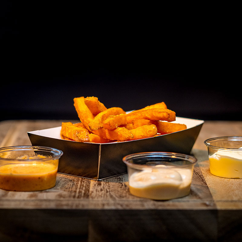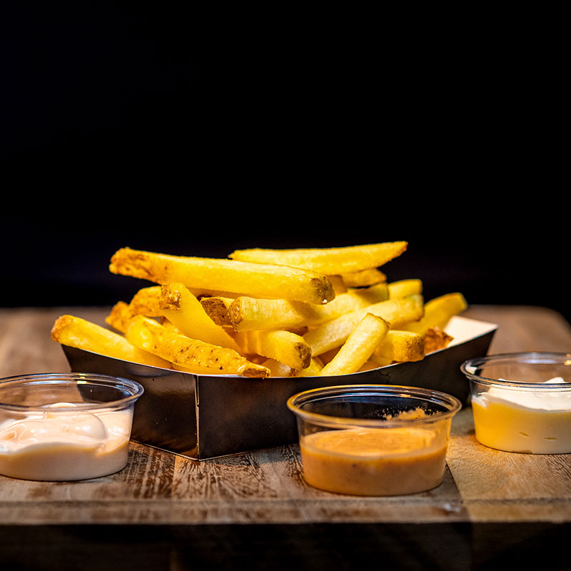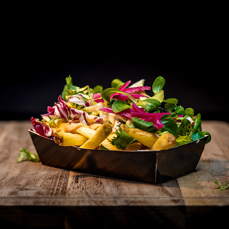 Tuunatut Isot ranskalaiset, Chipotle-kastike, pikkelöity punasipuli, salaattisekoitus